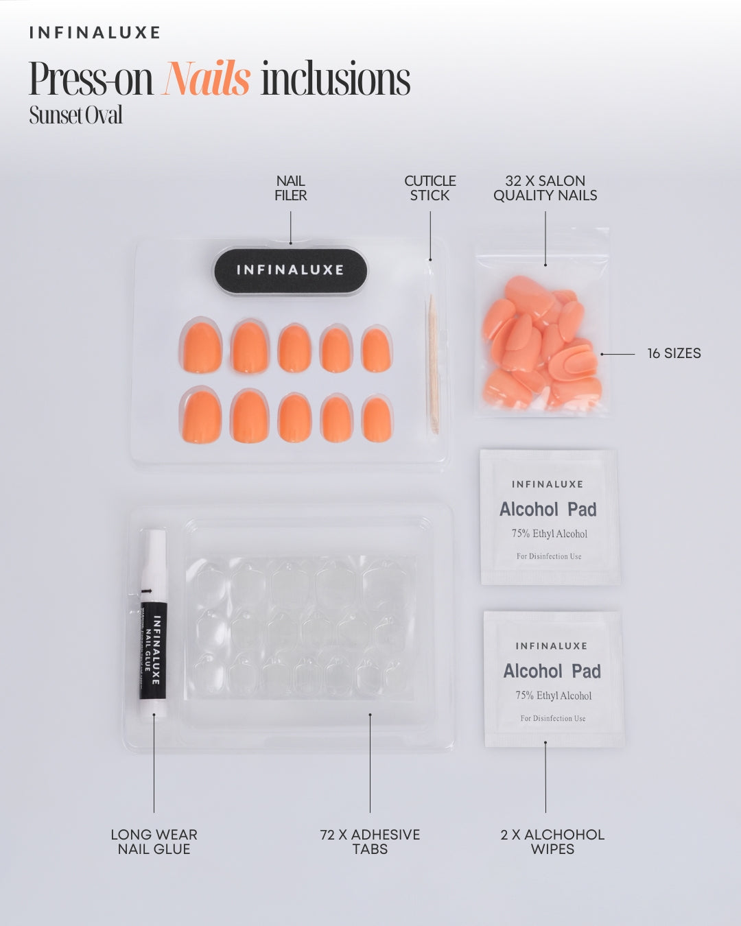 - 32 x salon quality press-on nails in 16 sizes (suitable for all nailbed sizes)