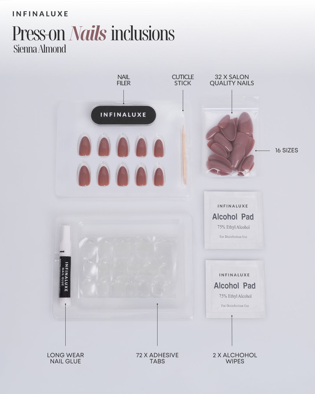 - 32 x salon quality press-on nails in 16 sizes (suitable for all nailbed sizes)