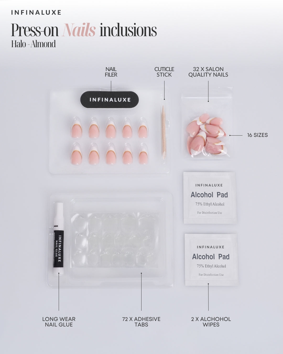 - 32 x salon quality press-on nails in 16 sizes (suitable for all nailbed sizes)
